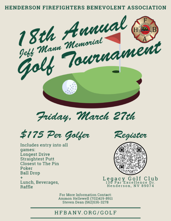 Since its inception by Captain Kevin Fedrizzi in 2009, the Jeff Mann Memorial Golf Tournament has been and continues to be the largest annual fundraiser for the Henderson Firefighters Benevolent Association. Originally established in the memory of fallen firefighter Jeff Mann of the Henderson Fire Department, the tournament raises money to support the operations and program needs of the HFBA.